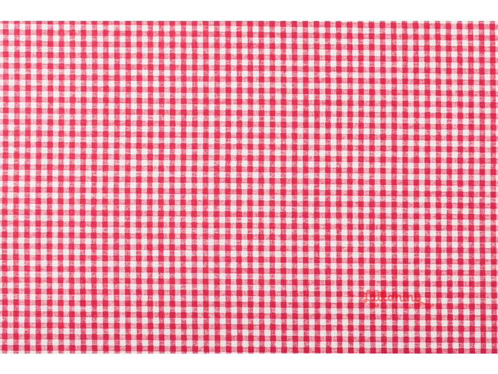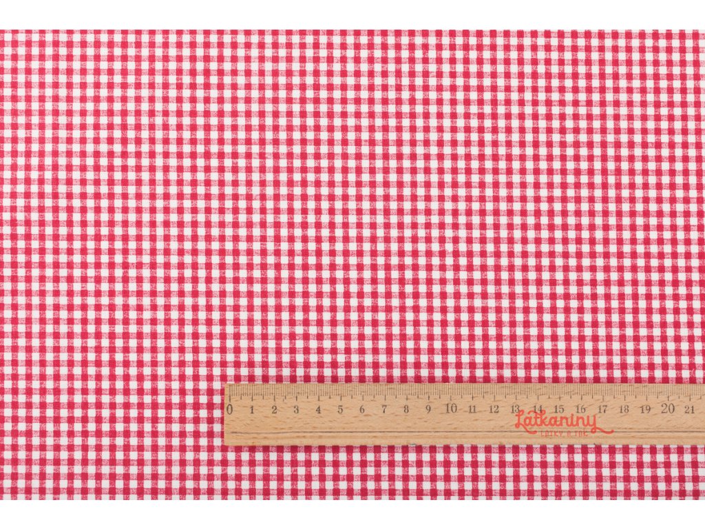 Motivem látky je kostičkovaný vzor, kostička, kostičky. Může představovat starobylý styl našich babiček, romantickou minulost, vintage, život na venkově, chalupářský styl. Kostička je červenobílá o velikosti 3x3 mm.