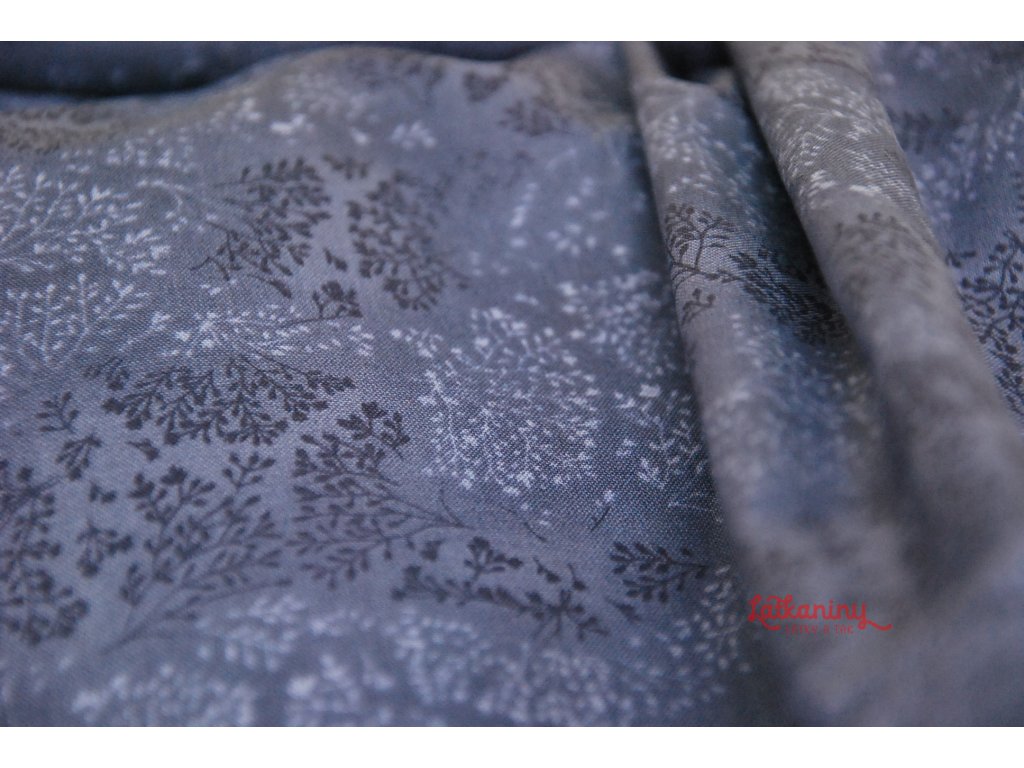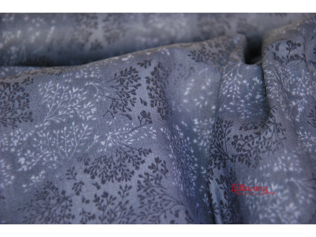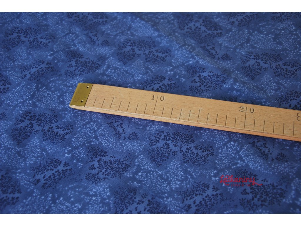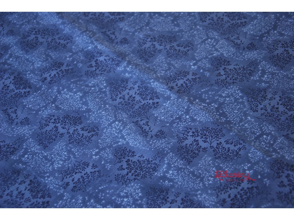 Motivem látky jsou větvičky s drobnými lístky. Vzory mají světle či tmavě modrý barevný odstín a nádherně je doplňuje modrý podklad. Tisk působí nenápadně a harmonicky. Nádherná látka pro milovníky přírody.