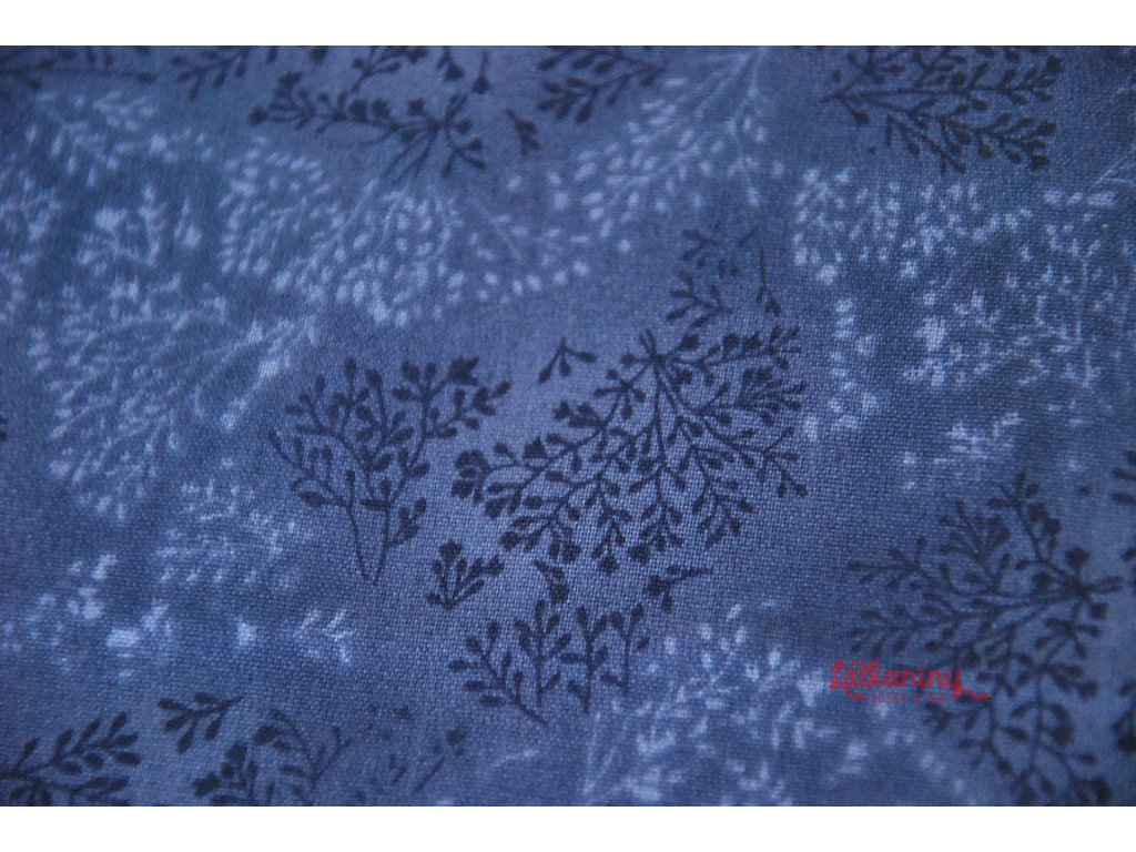 Motivem látky jsou větvičky s drobnými lístky. Vzory mají světle či tmavě modrý barevný odstín a nádherně je doplňuje modrý podklad. Tisk působí nenápadně a harmonicky. Nádherná látka pro milovníky přírody.