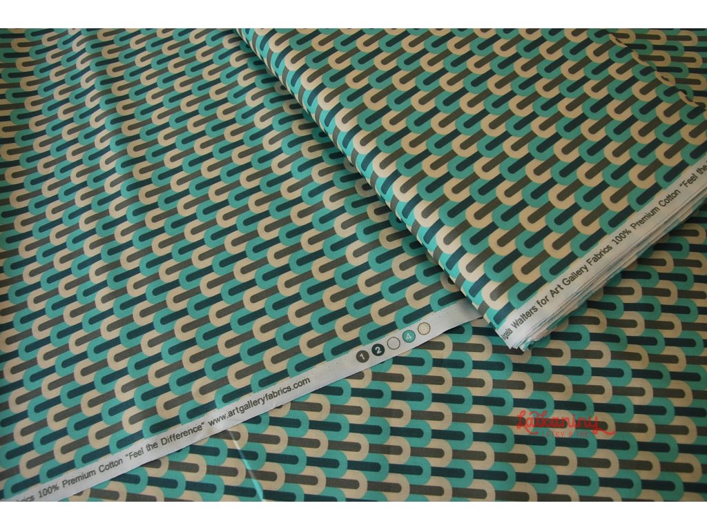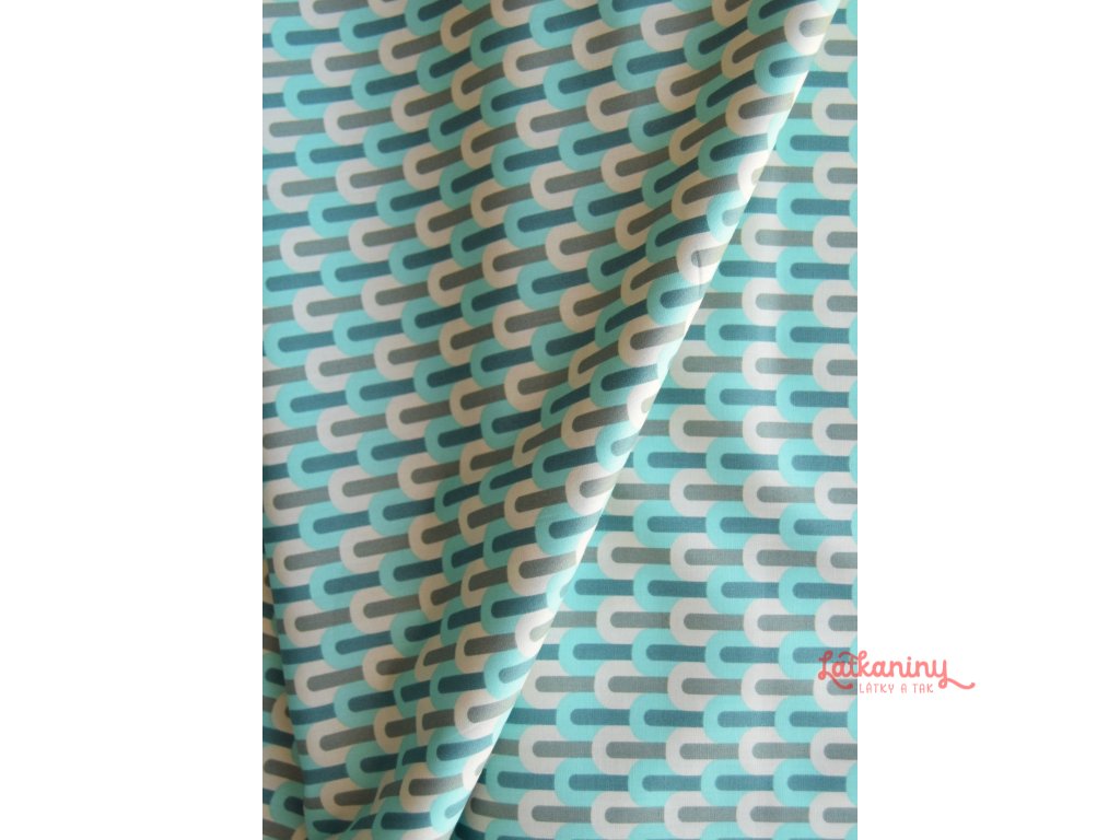 Motivem látky je geometrický vzor. Na látce jsou vyobrazeny pravidelně se opakující obloučky, pruhy, proužky. Převažující barvou je peprmintově zelená, peprmint. Doplňkovou barvou je šedá, růžová. Barvy jsou v pastelových odstínech.