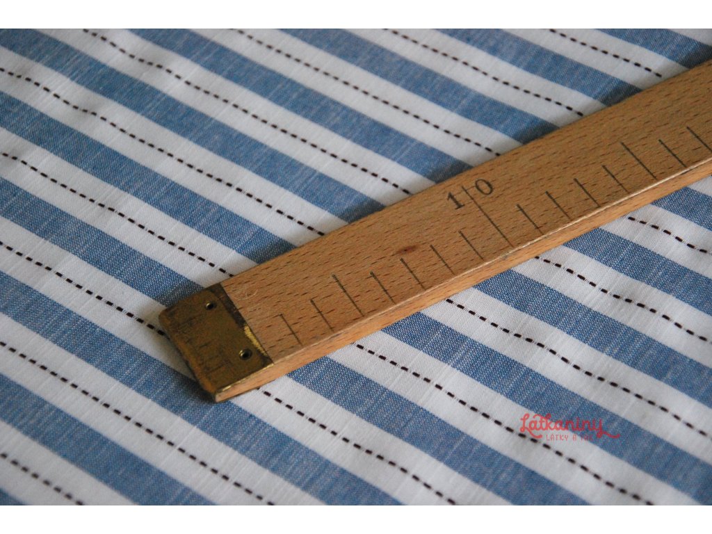 Jedná se o zajímavě řešenou pruhovanou látku na košili. Na materiálu se střídají modré a bílé pruhy. Širší bílý pruh protíná tmavě červené štepování. Látka je lehce průhledná.
