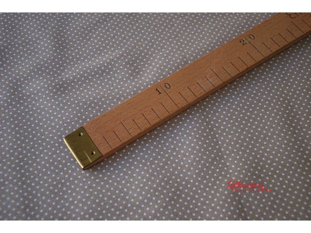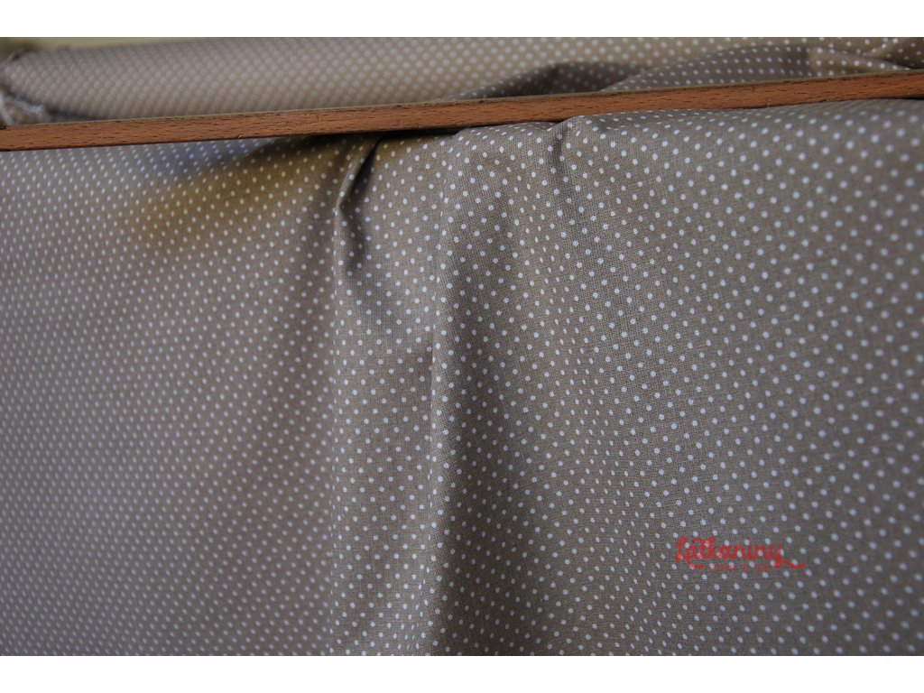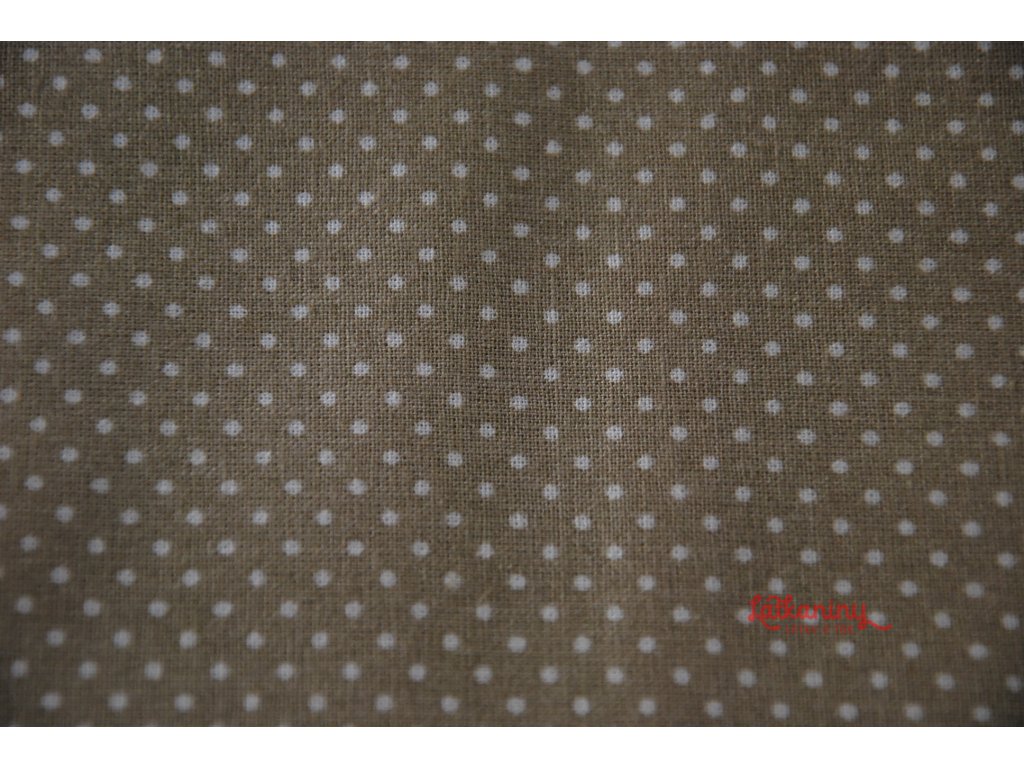 Motivem látky jsou bílé puntíčky o velikosti 2 mm. Podkladová barva je béžová.