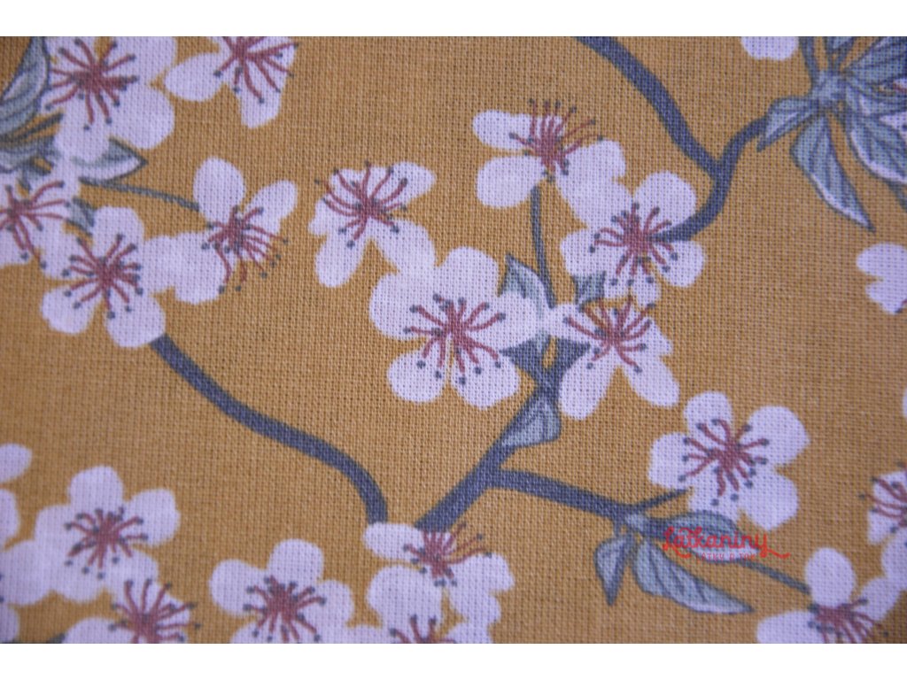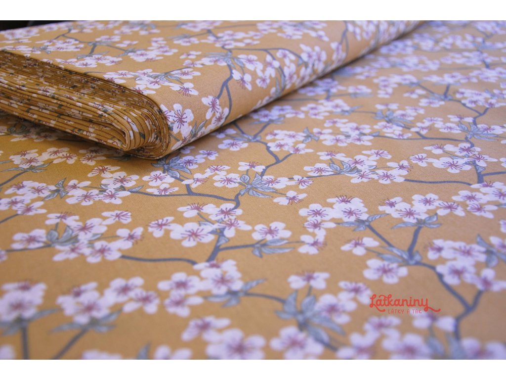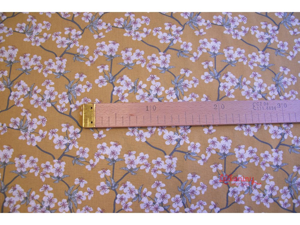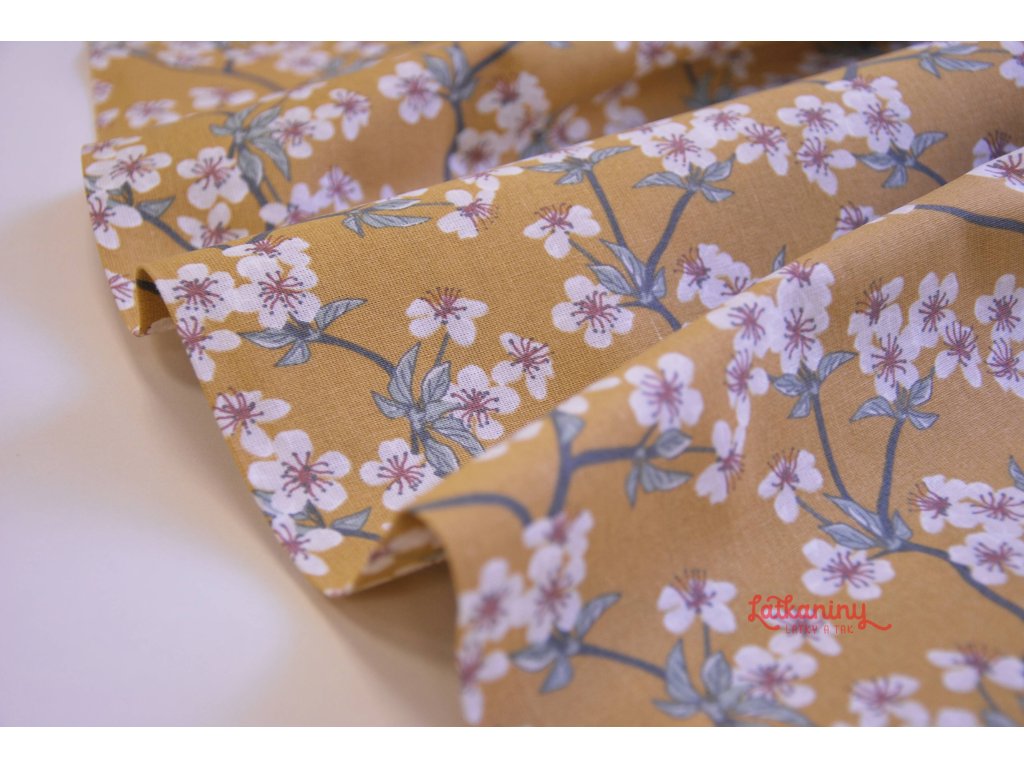 Motivem látky jsou větvičky s rozkvetlými květy na horčicovém podkladu. Květy jsou ve smetanové barvě s hnědými pestíky. Převažující barva látky je horčicová.