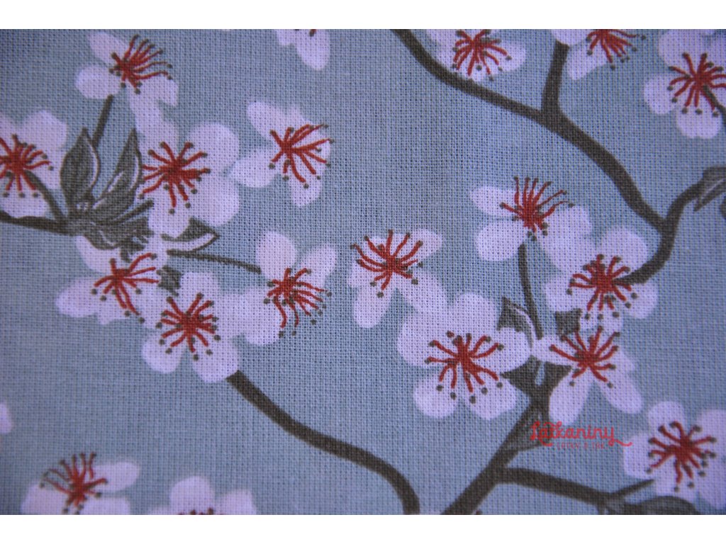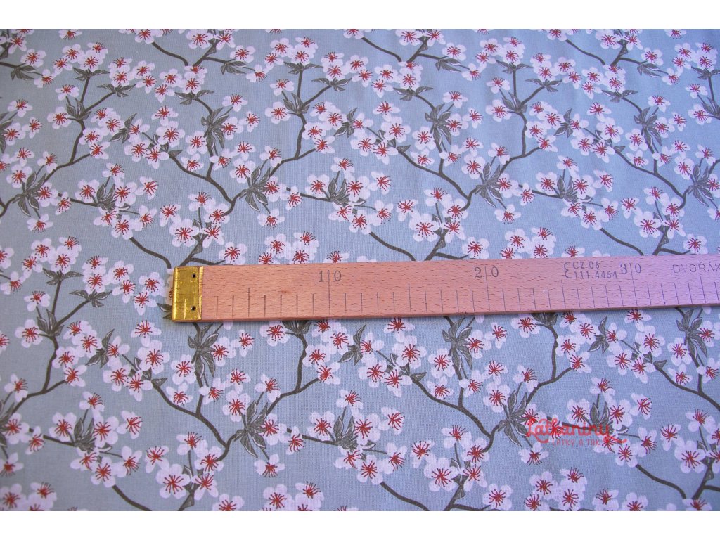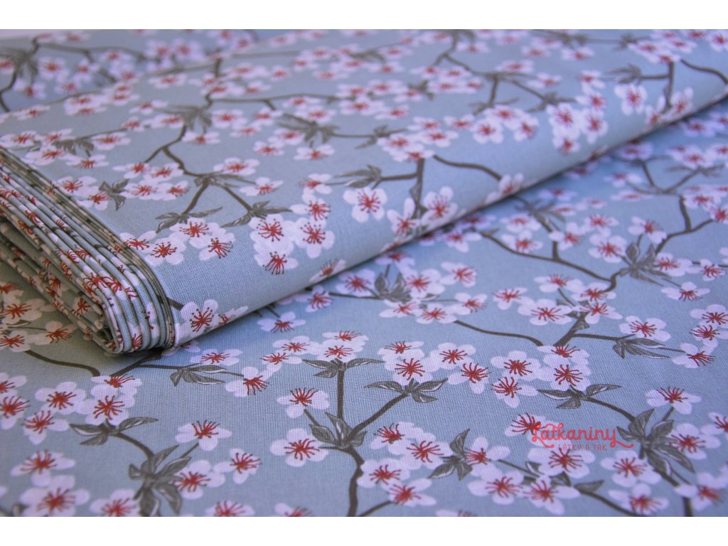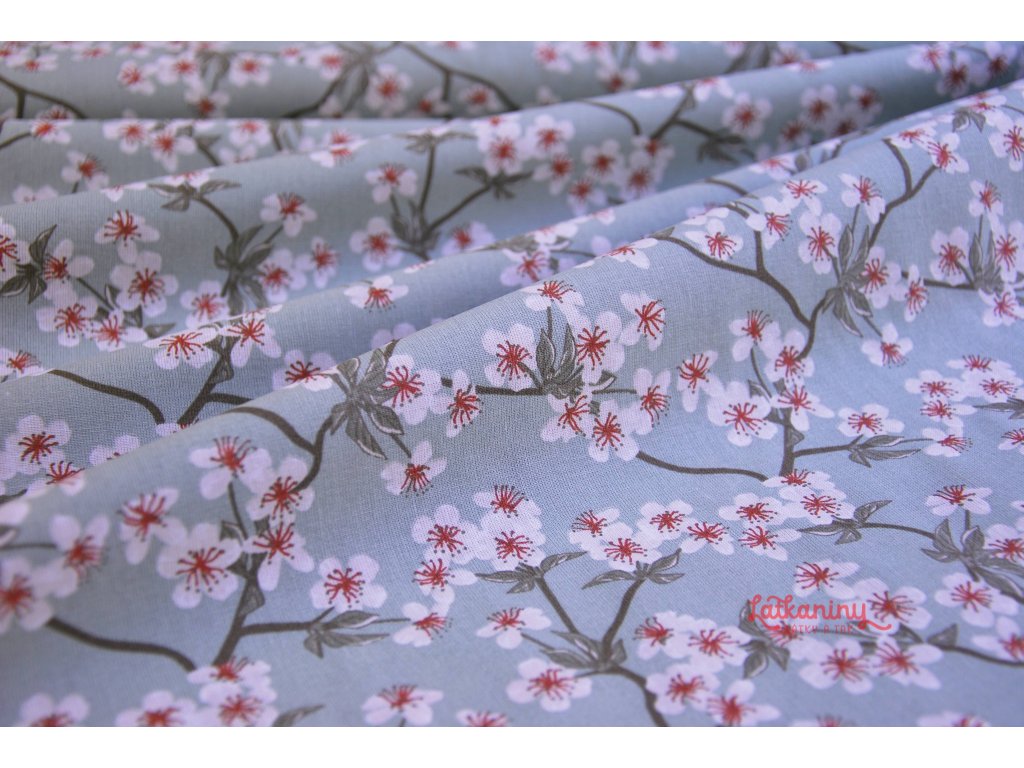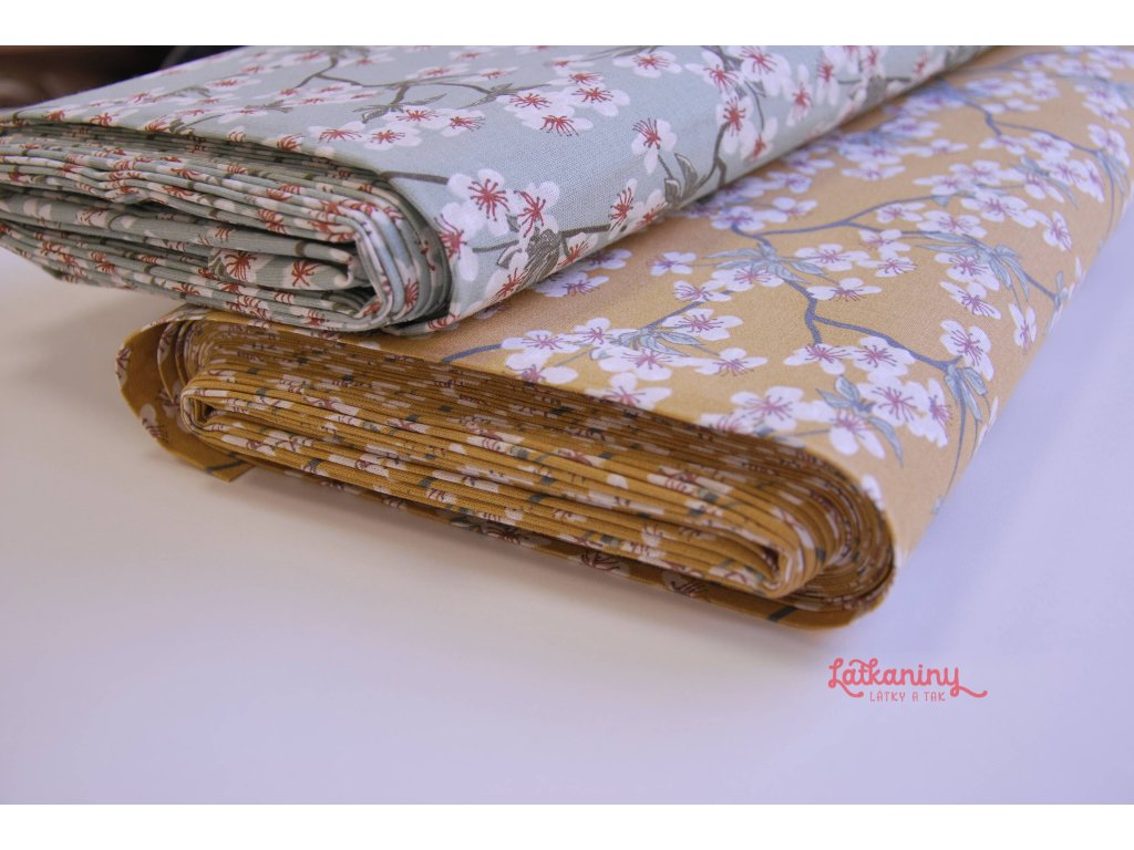 Motivem látky jsou větvičky s rozkvetlými květy na světle zeleném podkladu. Květy jsou ve smetanové barvě s hnědými pestíky. Převažující barva látky je světle zelená.