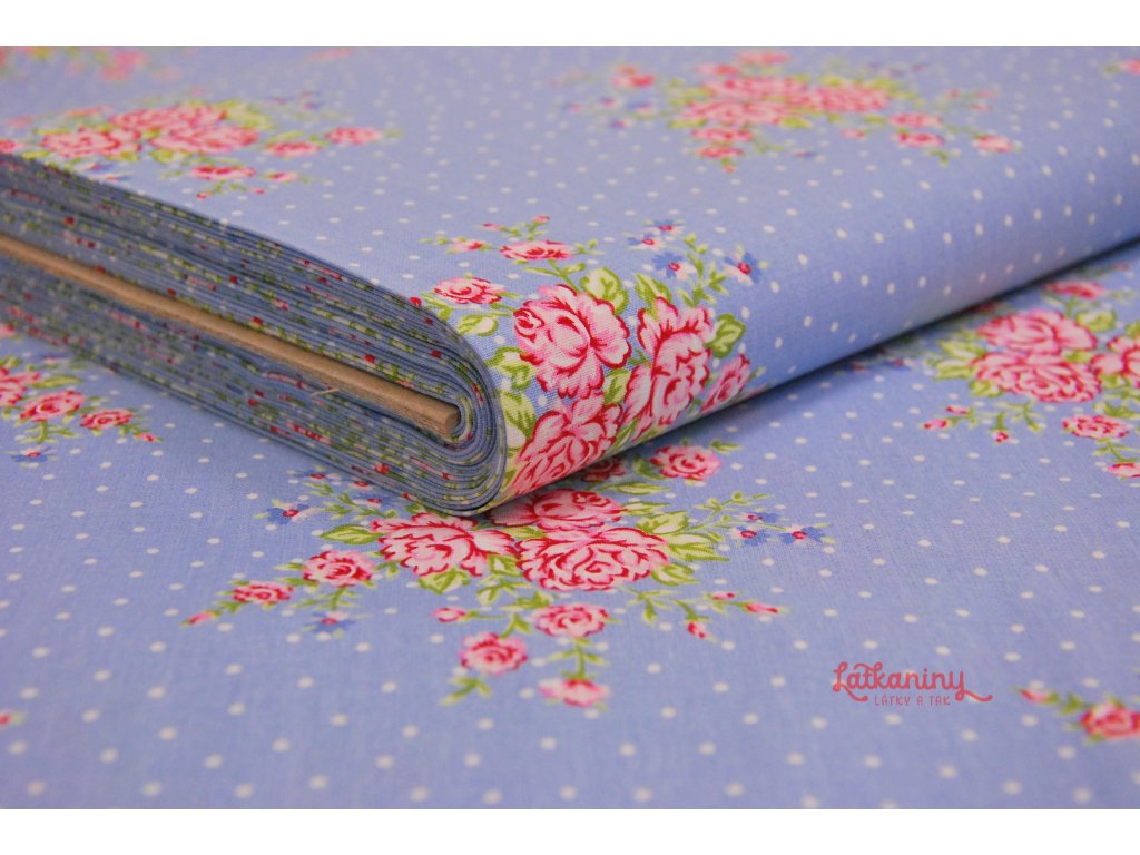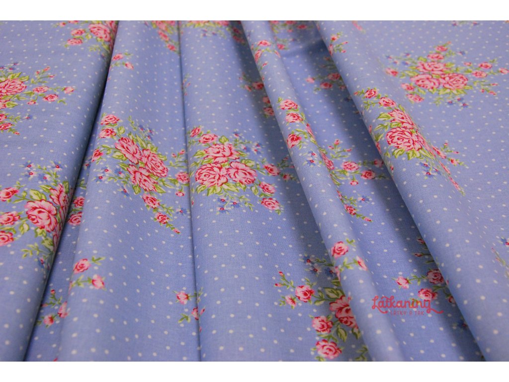 Motivem látky je květovaný vzor na tečkovaném pozadí. Na látce jsou vyobrazeny květy v růžových odstínech se zelenými lístky. Převažující barvou je modrá.