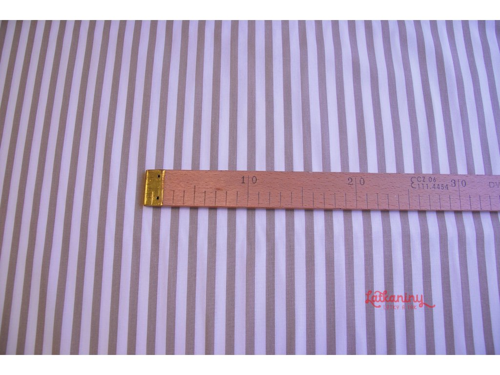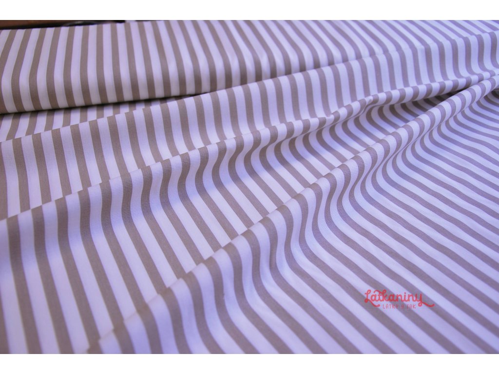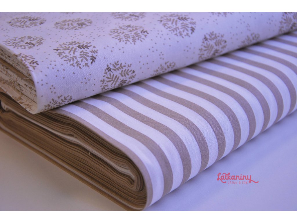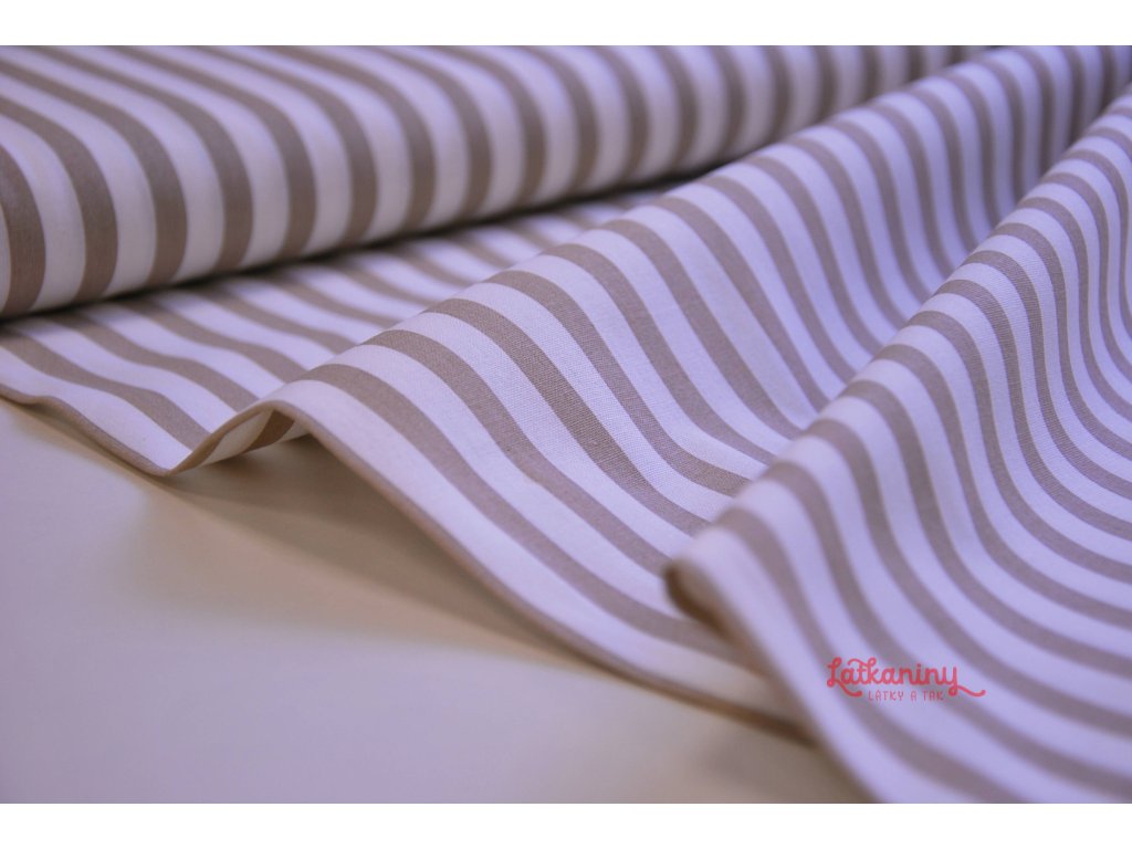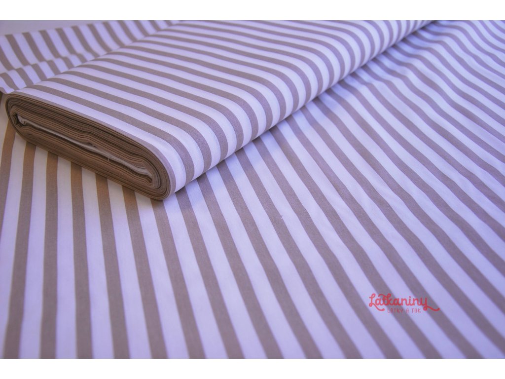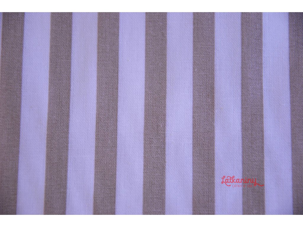 Motivem látky jsou světle hnědé/latte proužky o šířce 8 mm. Pruhy jsou tištěny po délce látky tzn. po osnově.