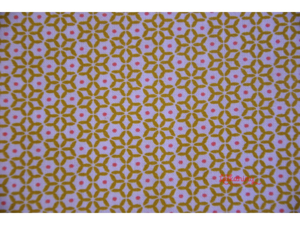 Motivem látky je geometrický tvar připomínající kytičku s růžovými tečkami. Kytička je žlutá na bílém podkladu. Převažující barva látky je bílá. Látka je lehce průhledná.