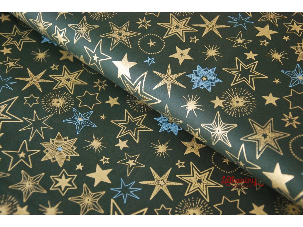 Motivem látky jsou hvězdy, hvězdičky, které jsou vyobrazené mnoha způsoby zlatotiskem. Podkladovou barvou je temně zelená. Látka působí slavnostně a noblesně. Prostě Vánoce!