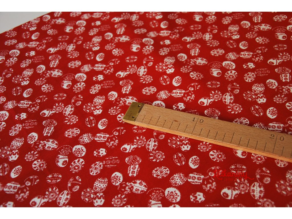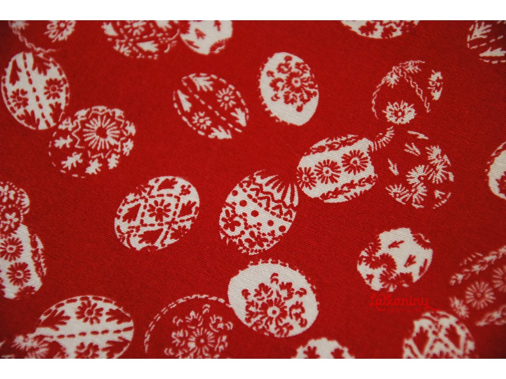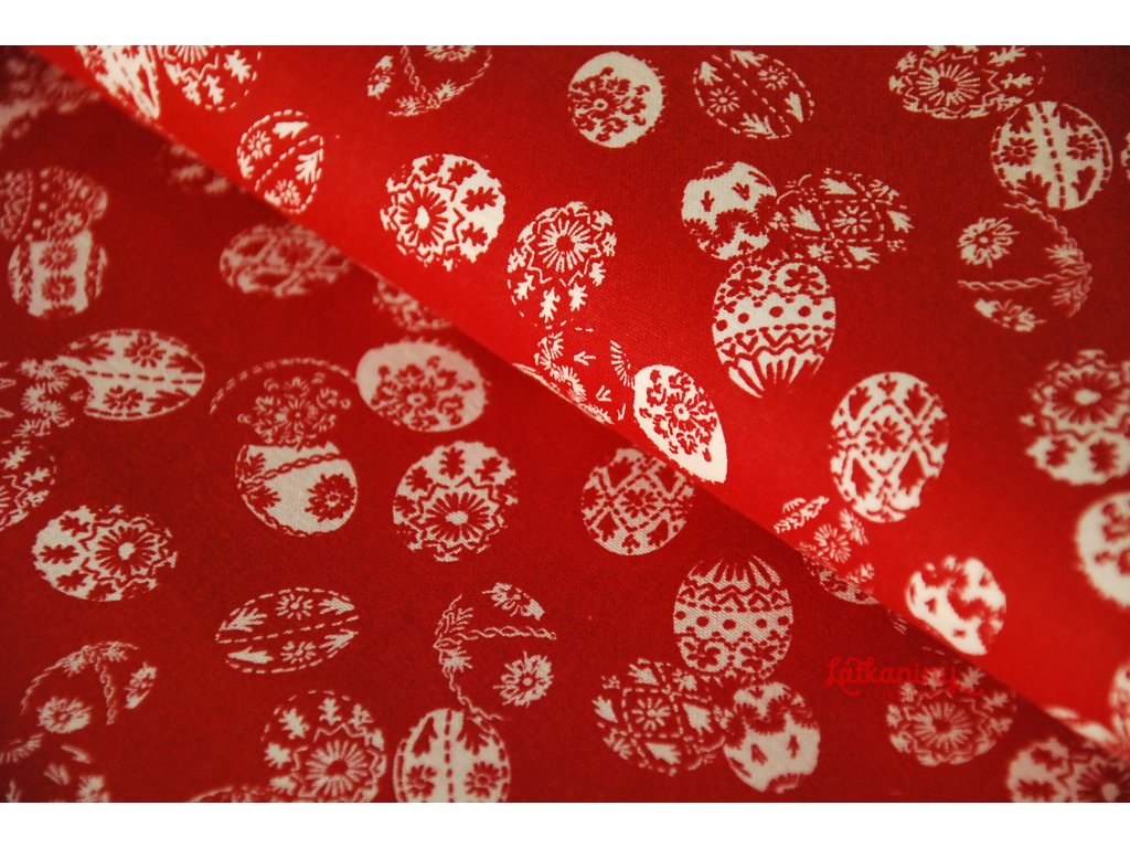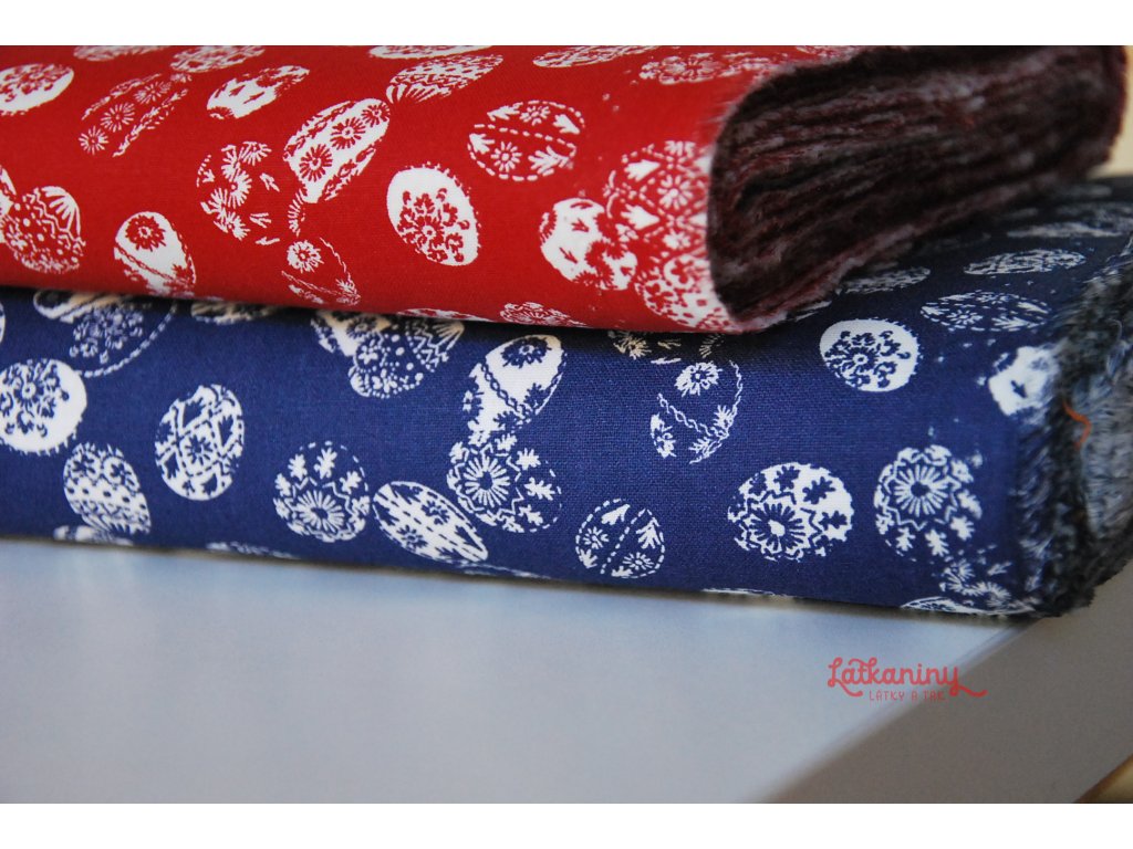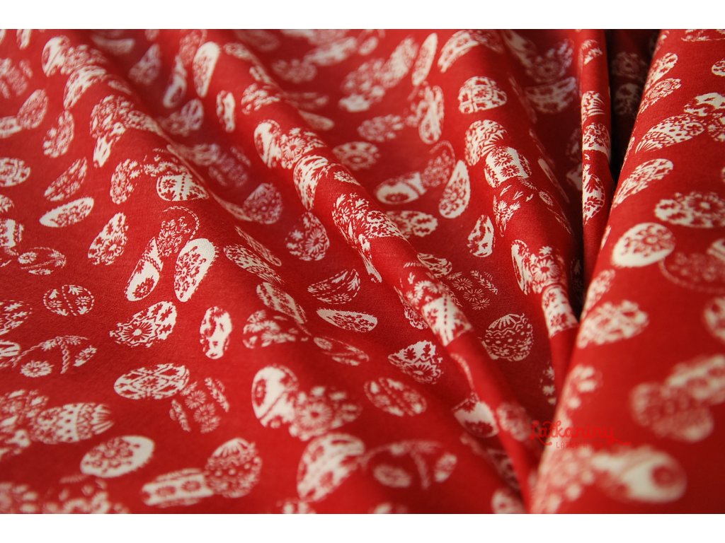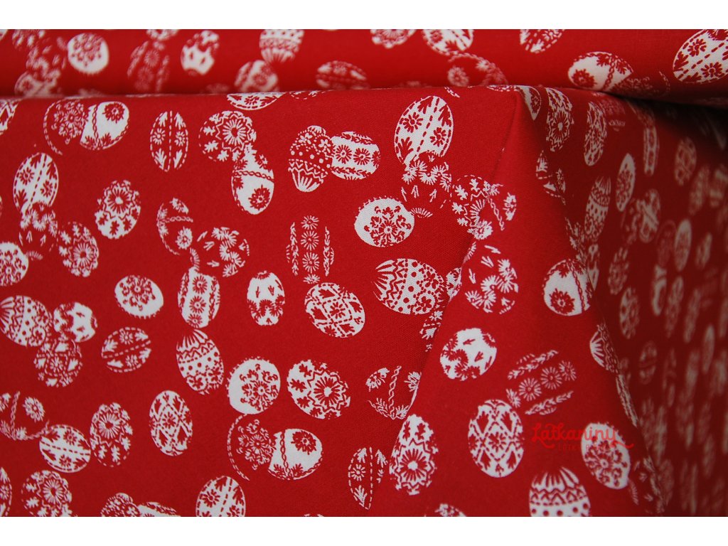 Motivem látky jsou Velikonoce, svátky jara, kraslice, malovaná vajíčka. Kraslice jsou na materiálu zachycená střídavě technikou pozitiv a negativ. Některá jsou tedy červená s bílými konturami, ostatní bílá s červeným zdobením. Podkladovou barvou je červená. Prostě VELIKONOCE!