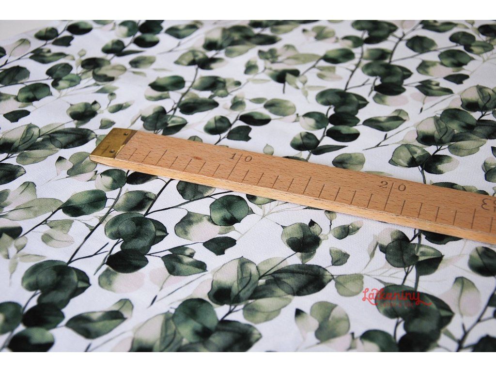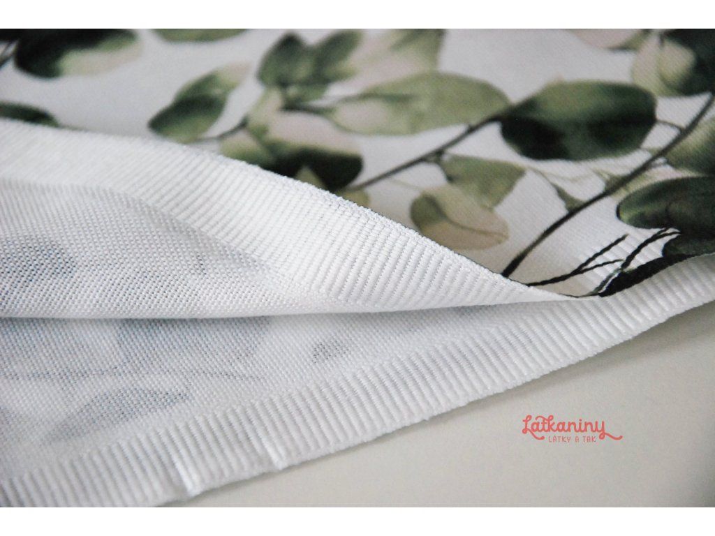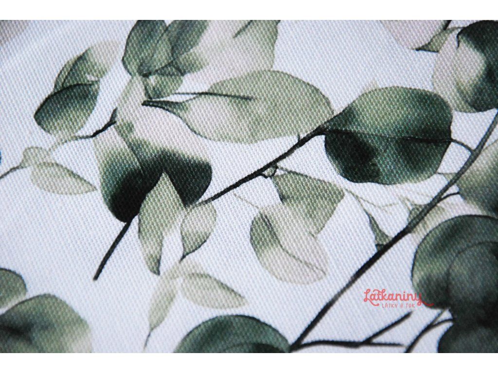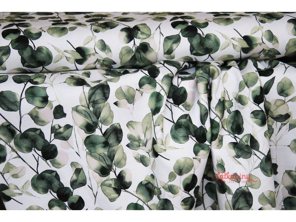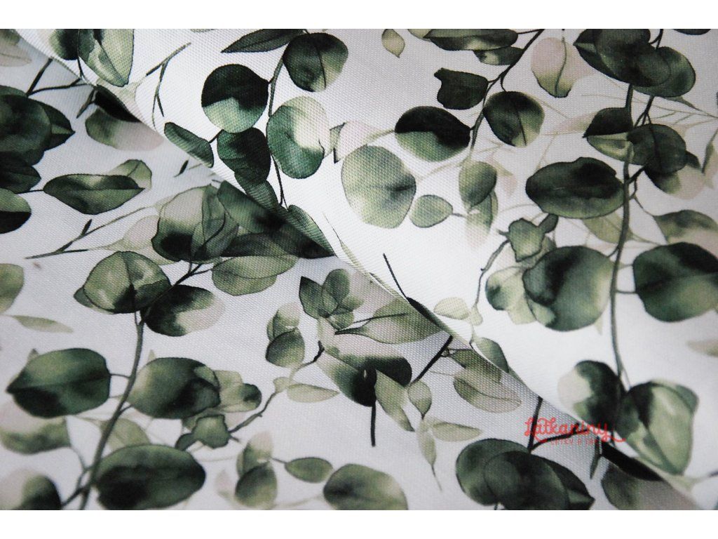 Motivem látky jsou lístky eukalyptu v odstínech zelené barvy, které se pnou materiálem. Podkladovou barvou je smetanová nebo také ecru, tedy barva surového, neběleného plátna.