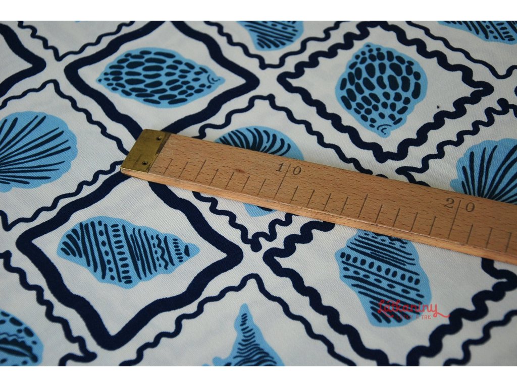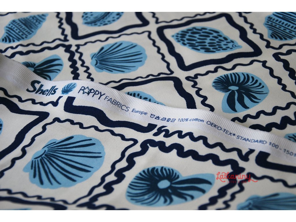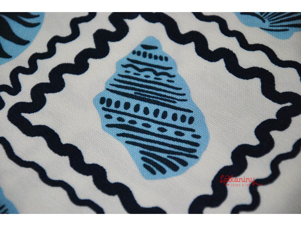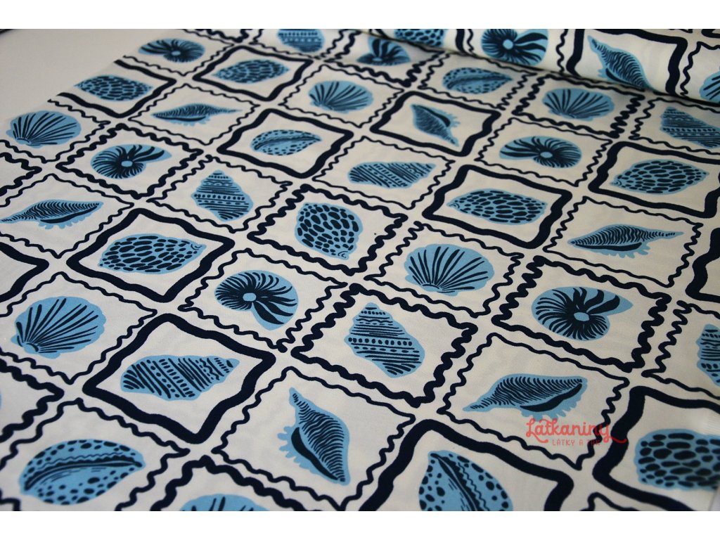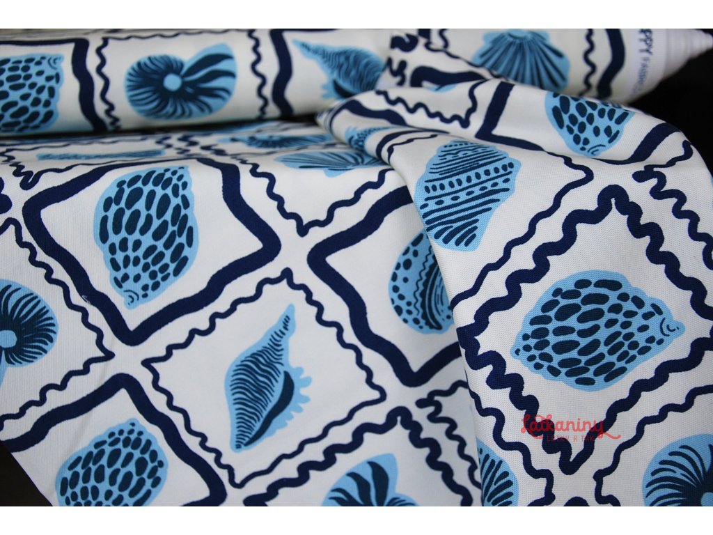 Motivem látky jsou mušle, lastury v odstínech modré barvy, které jsou orámované tmavě modrými nepravidelnými čtverci. Podkladovou barvou je smetanová nebo také ecru, tedy barva surového, neběleného plátna.