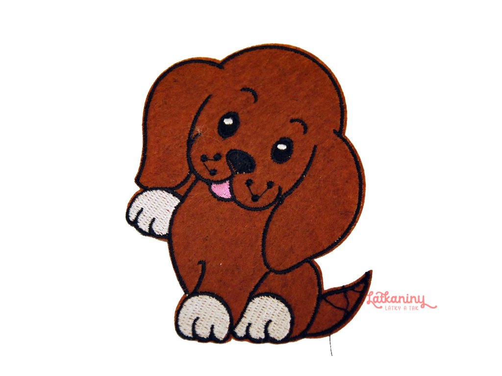 Nažehlovací vyšívaná aplikace ve tvaru celé postavy hnědého psíka.