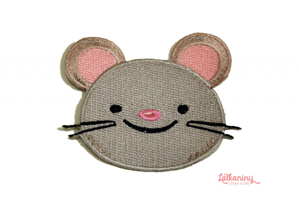 Nažehlovací vyšívaná aplikace ve tvaru hlavy myšky.