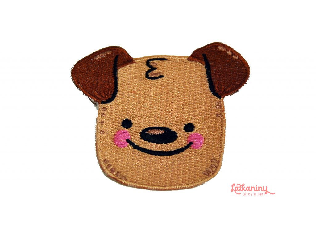 Nažehlovací vyšívaná aplikace ve tvaru hlavy pejska.