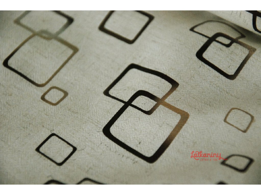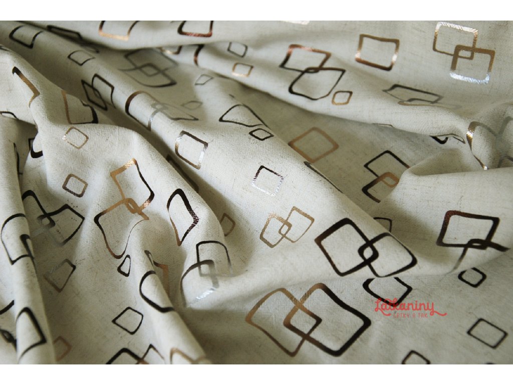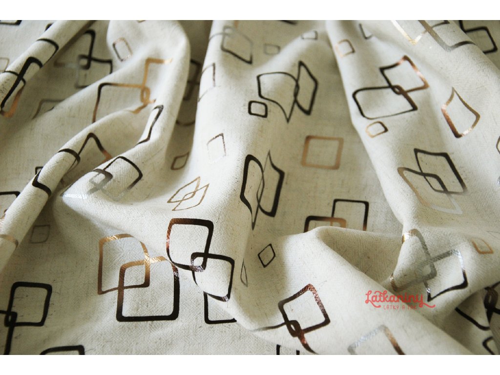 Látka má geometrický vzor. Jedná se o navzájem propletené čtverce. Jejich kontury jsou naneseny fóliovým tiskem, mění se od stříbrné ke zlaté. Podklad tvoří režná barva. Materiál jak stvořený pro letní horké dny.
