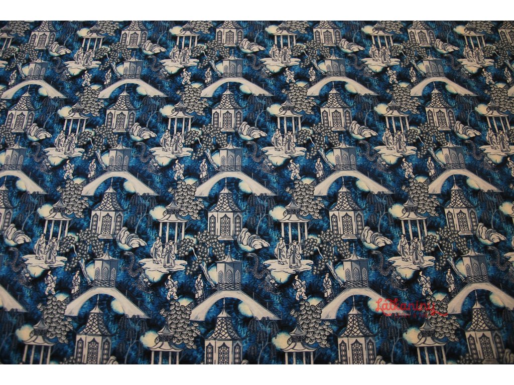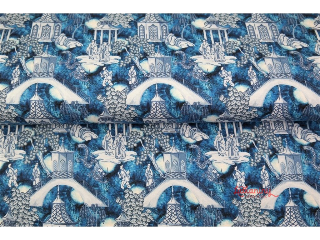 Motivem látky jsou buddhističtí mniši, kteří se procházejí kolem jejich svatyně. Mezi chrámy létají draci. Látka je v tónech modré a bílé barvy. Je zajímavá svým originálním tiskem.